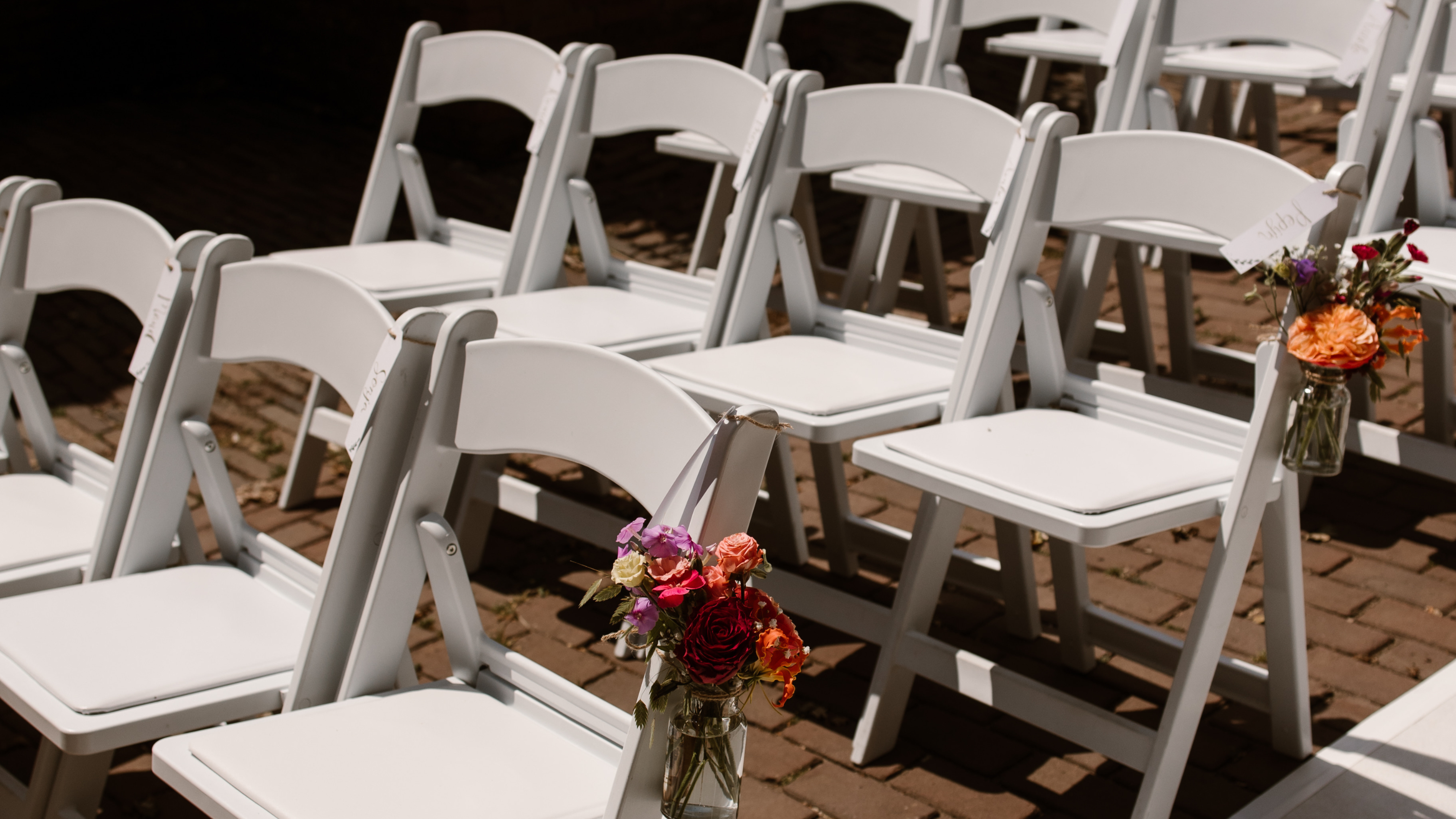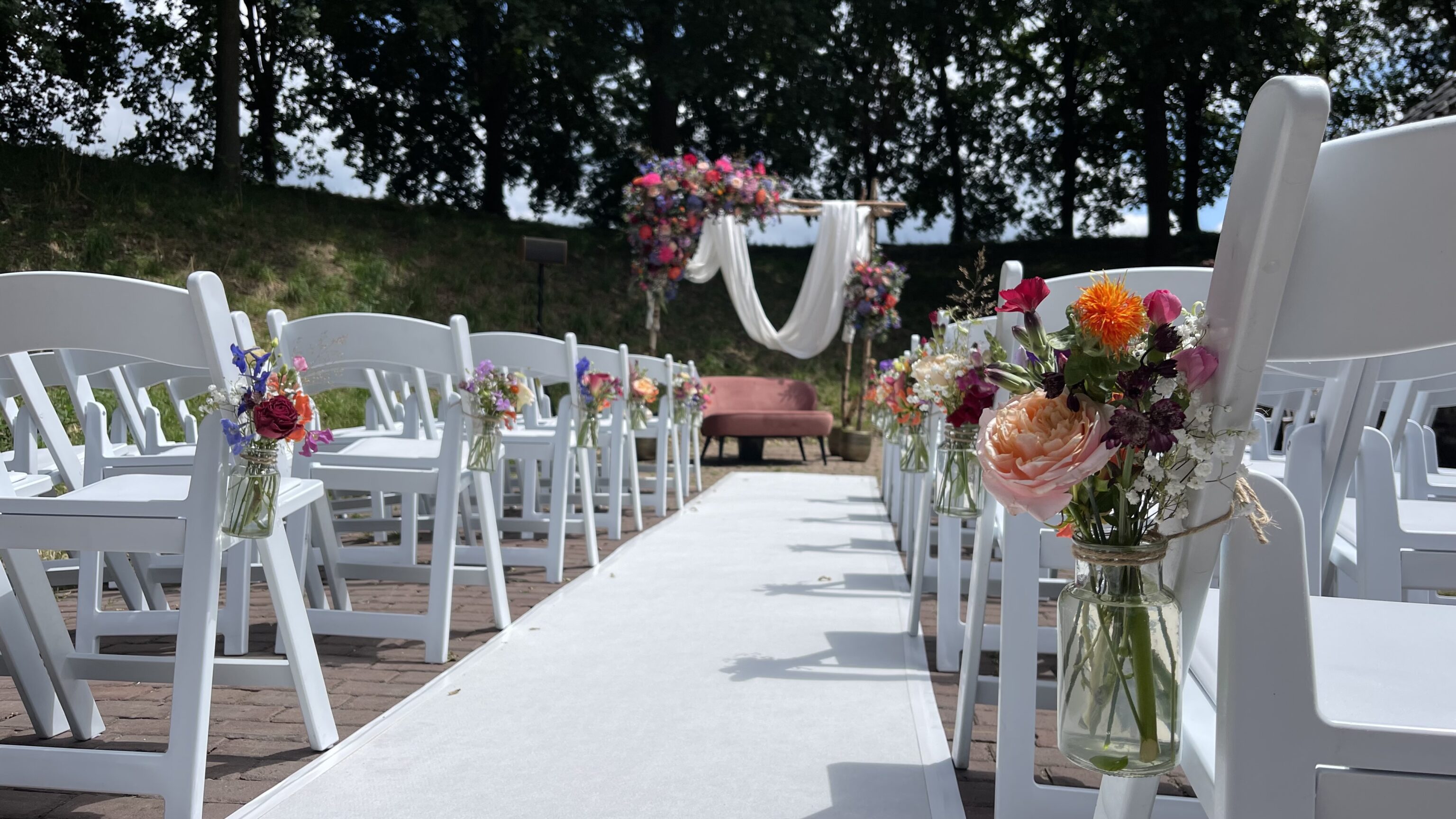 Rond 14:00 uur druppelden de daggasten binnen op het terras van het Cachot. De ceremonie vond plaats in de buitenlucht, achter het pand, met witte weddingchairs, prachtige backdrop en een elegante witte loper