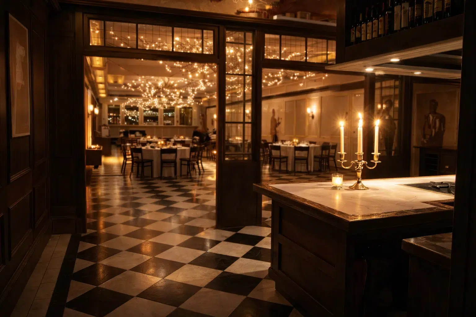 De Admiraalszaal is een trouwzaal met karakter. Zodra je binnenstapt voel je de historie van Fort Sint Gertrudis, gecombineerd met een stijlvolle en chique uitstraling. Het klassieke zwart-witte tegelpatroon, de houten deuren, het open kookeiland en de sfeervolle verlichting zorgen samen voor een elegante setting die meteen indruk maakt. Een ruimte waar alles klopt: stijlvol, warm en net even anders.